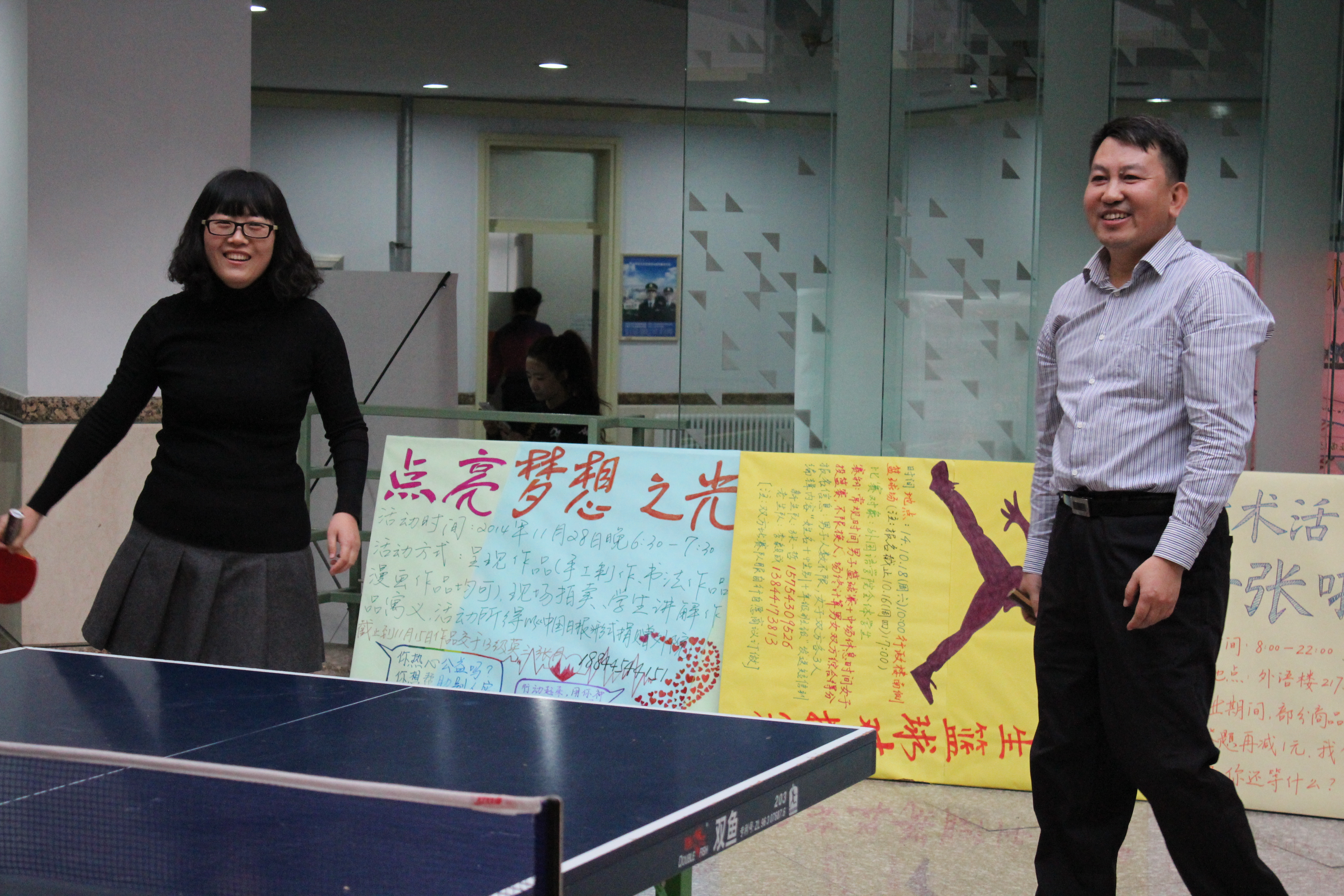 为丰富学院教师的业余生活,提高身体素质,增强竞争意识,迎接校第十四届“乒协杯”比赛,学院于11月7日下午在外语楼一楼大厅举办了第十五届“教师杯”乒乓球比赛。比赛项目包括男子单打,女子单打,男子双打,女子双打及混合双打五项,比赛规则采用国际标准(比赛为5局3胜制),实行淘汰制。